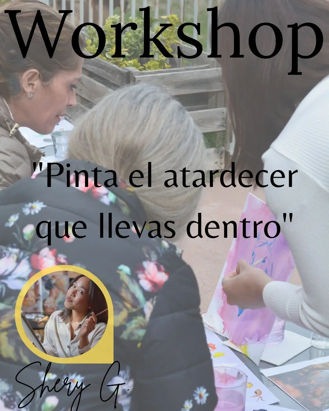 Por eso te invito a pasar conmigo una tarde entre pinceles, donde juntos atraparemos ese atardecer en un lienzo, jugando con los colores y dejando que cada trazo cuente una historia personal. Te espero para compartir este momento especial en nuestro workshop 'Atardecer entre pinceles'." Sheryl Gadiano